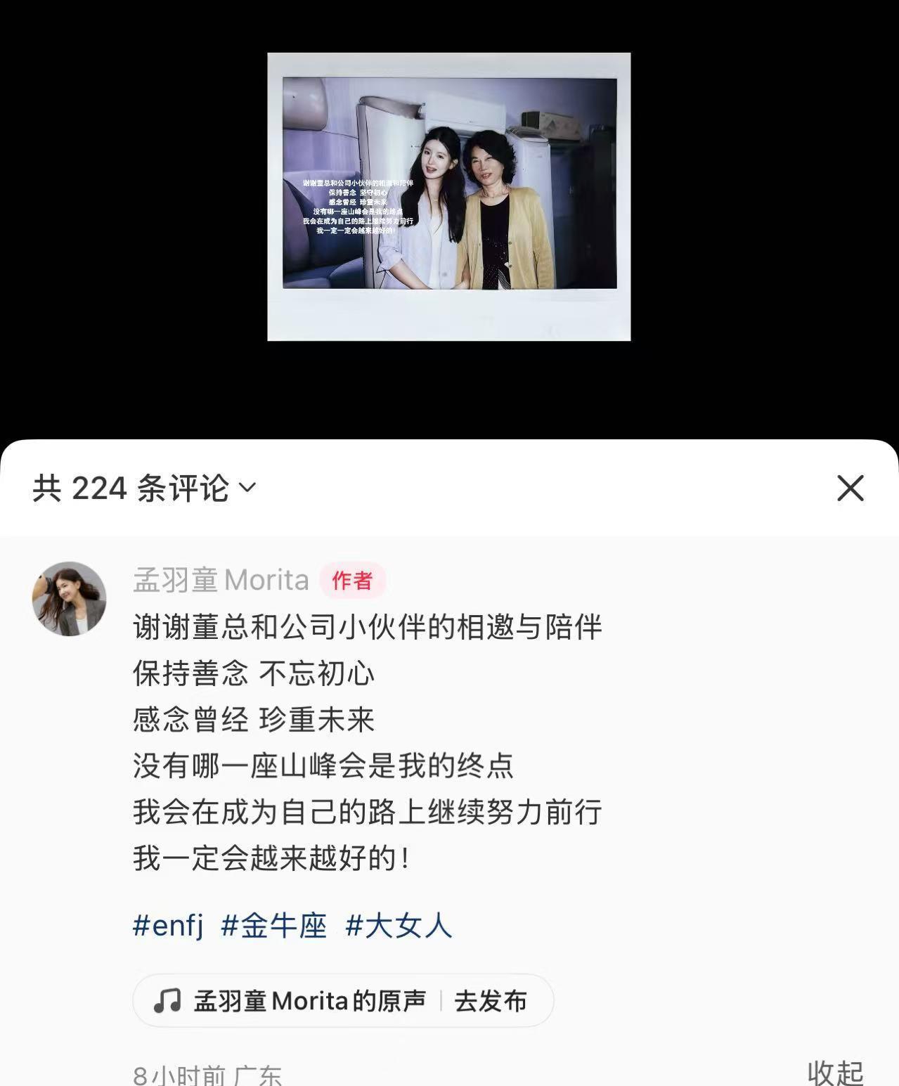 今日凌晨,孟羽童发文总结:“谢谢董总和公司小伙伴的相邀​与陪伴,保持善念,不忘初心,感念曾经,珍重未来。